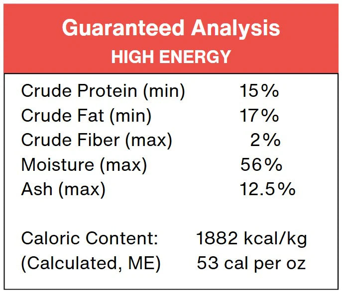 High Energy Breakdown: 68% raw muscle beef (17% fat), 10% washed fatty tripe, 10% ground beef bone, 5% liver, 2.5% spleen, 2.5% kidney, 2% heart