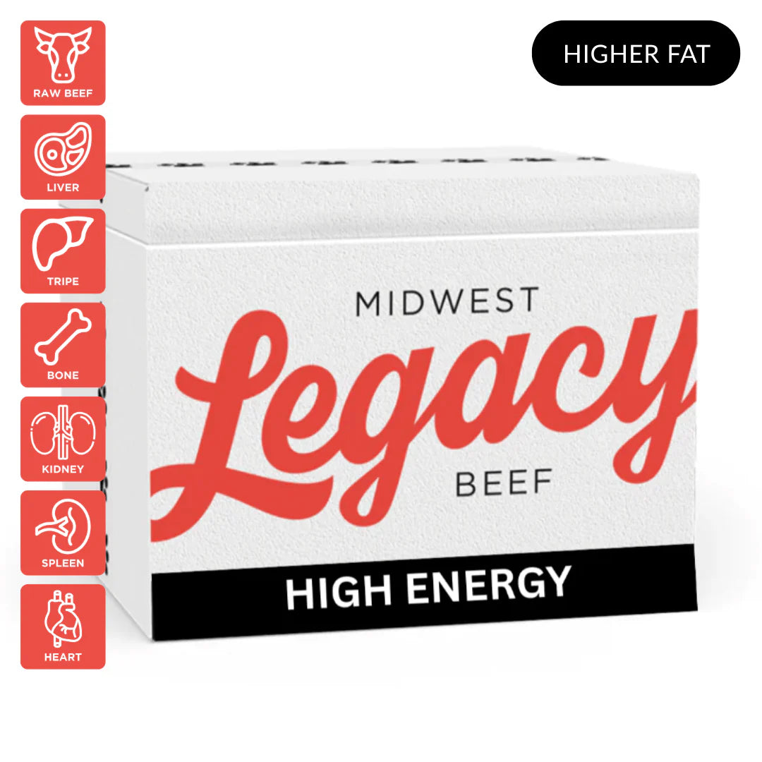 Looking for more punch out of your dogs food? Introducing Legacy HIGH ENERGY with 17% fat. This blend was created using fattier cuts of beef along with the same organ and bone mix found in our best selling BLT & Bone blend to create a high energy, high calorie (53 calorie/oz) product designed specifically for dogs needing extra energy. A great high energy source for: