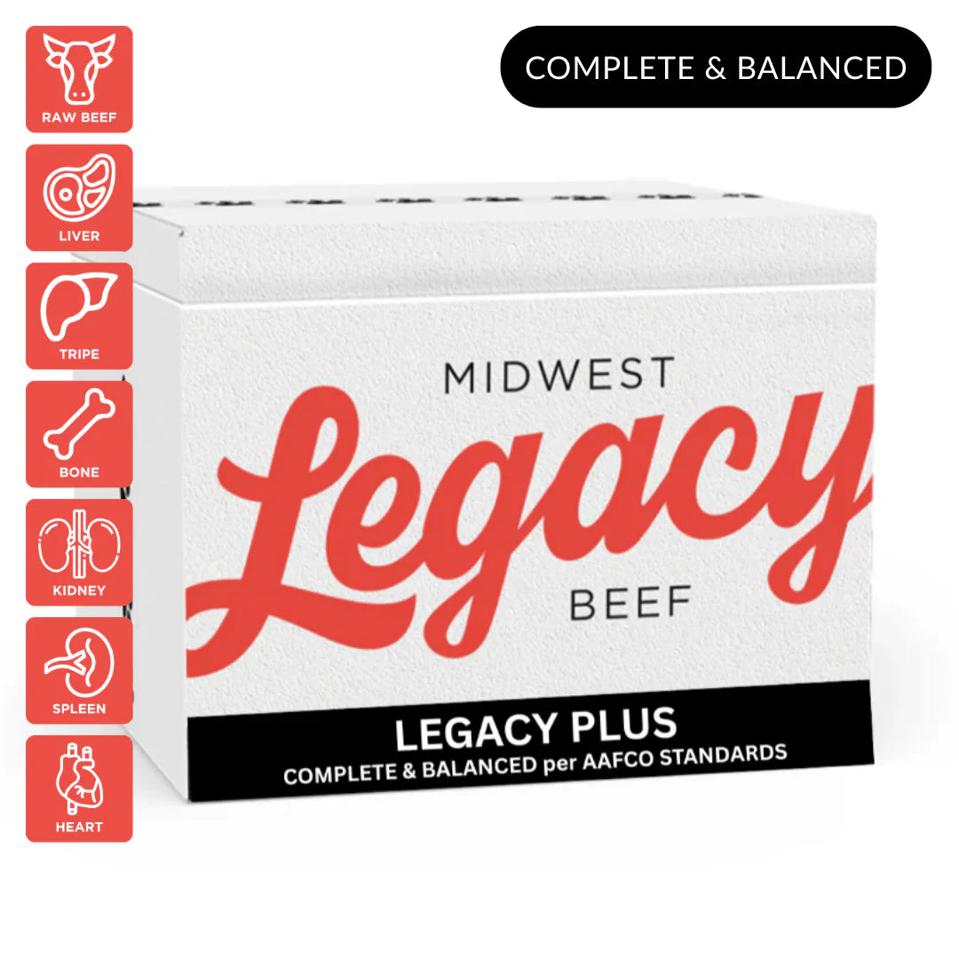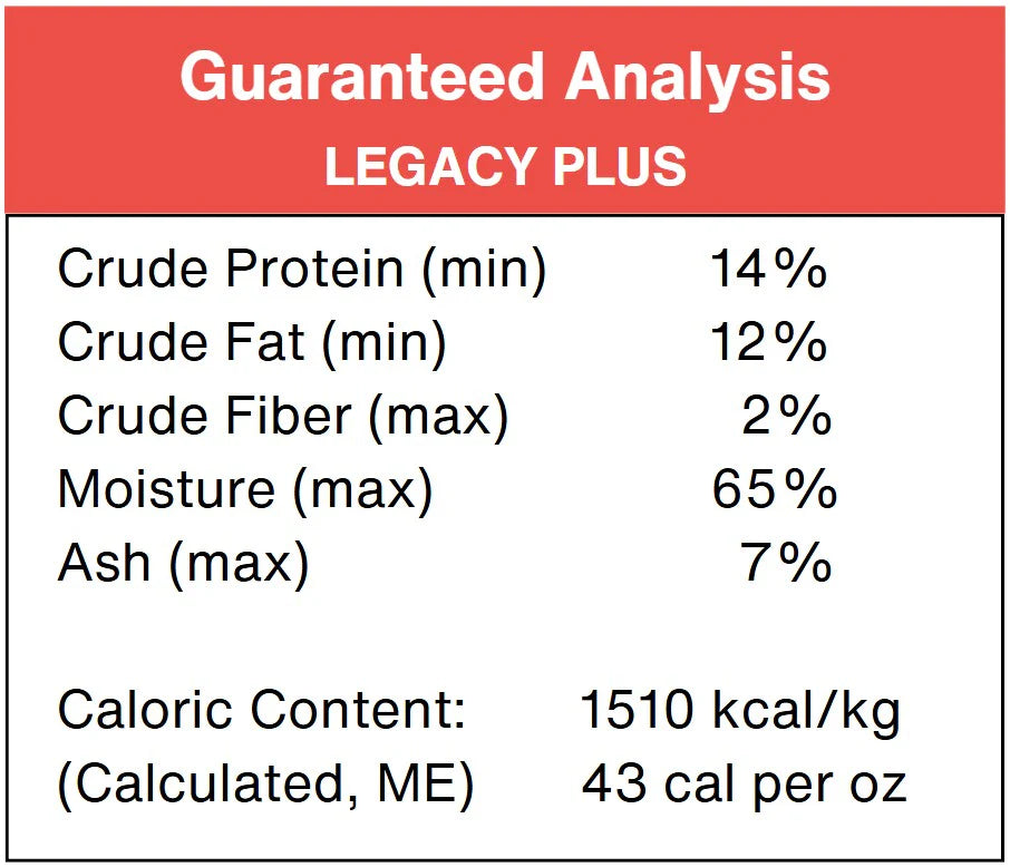 Legacy PLUS Breakdown: 67% raw muscle beef, 10% washed fatty tripe, 10% ground beef bone, 5% liver, 2.5% spleen, 2.5% kidney, 2% heart, 2% Refined Sunflower Oil, 1.65% Vitamin Mix, 0.4% Refined Salmon Oil.